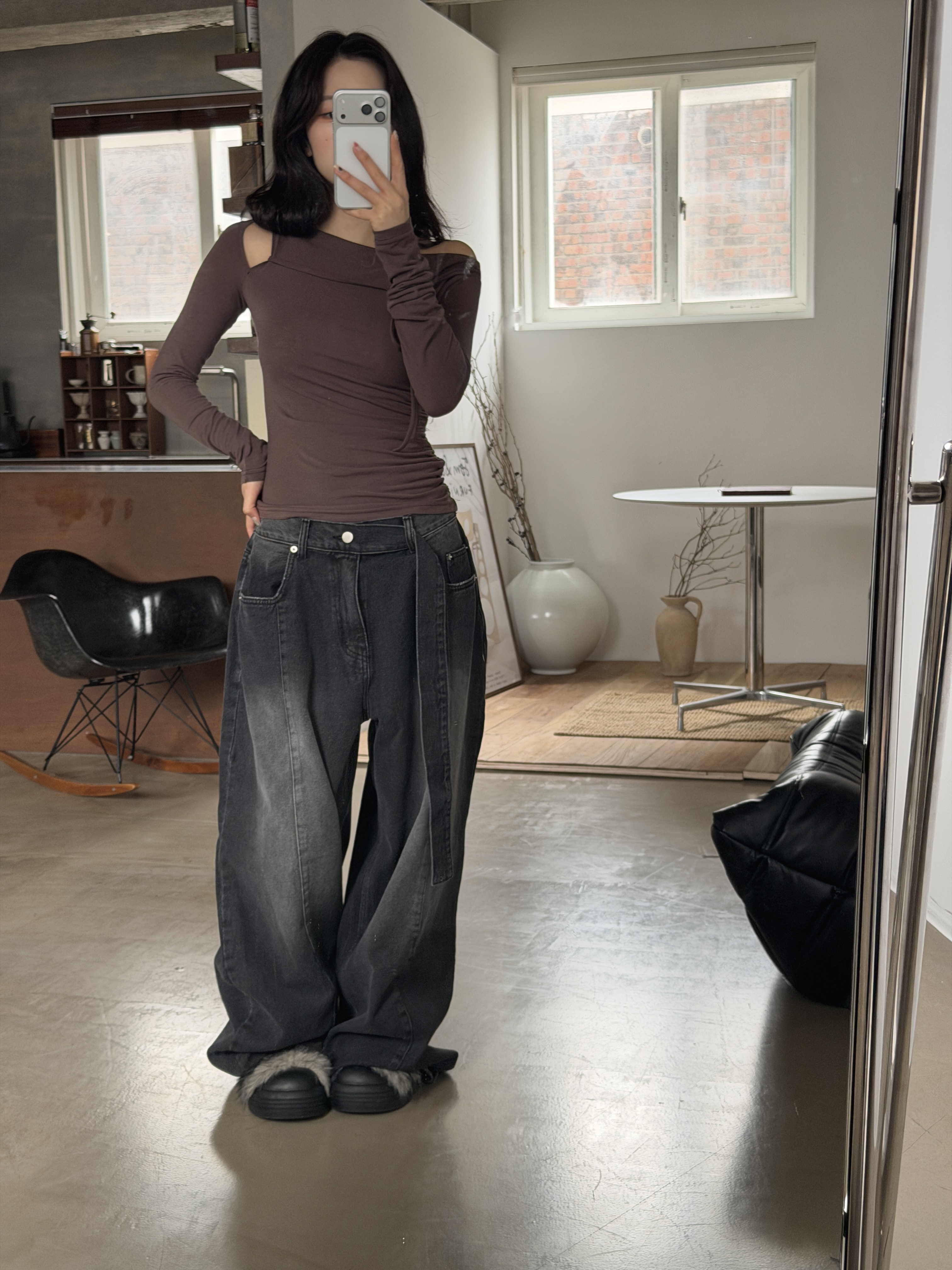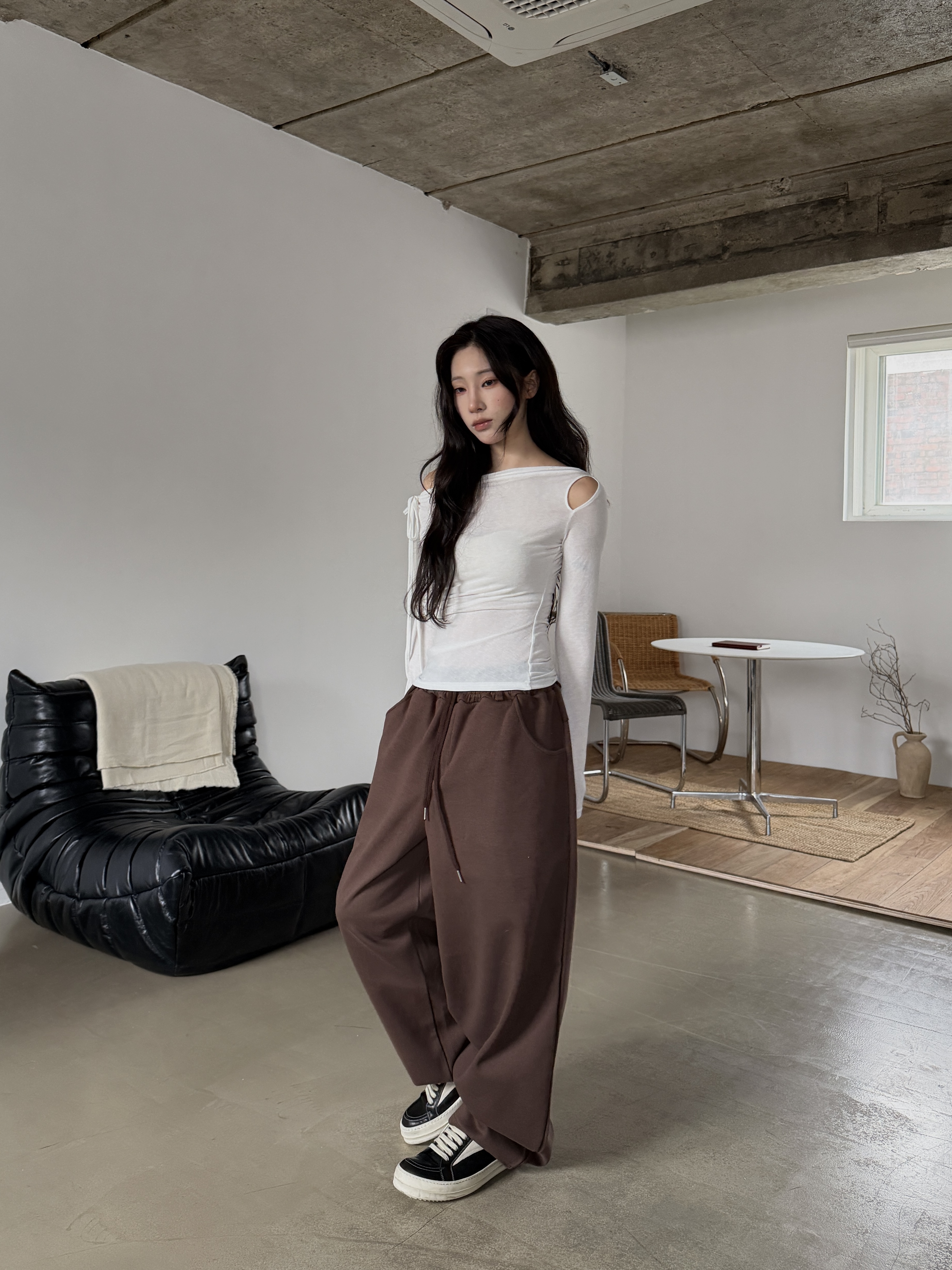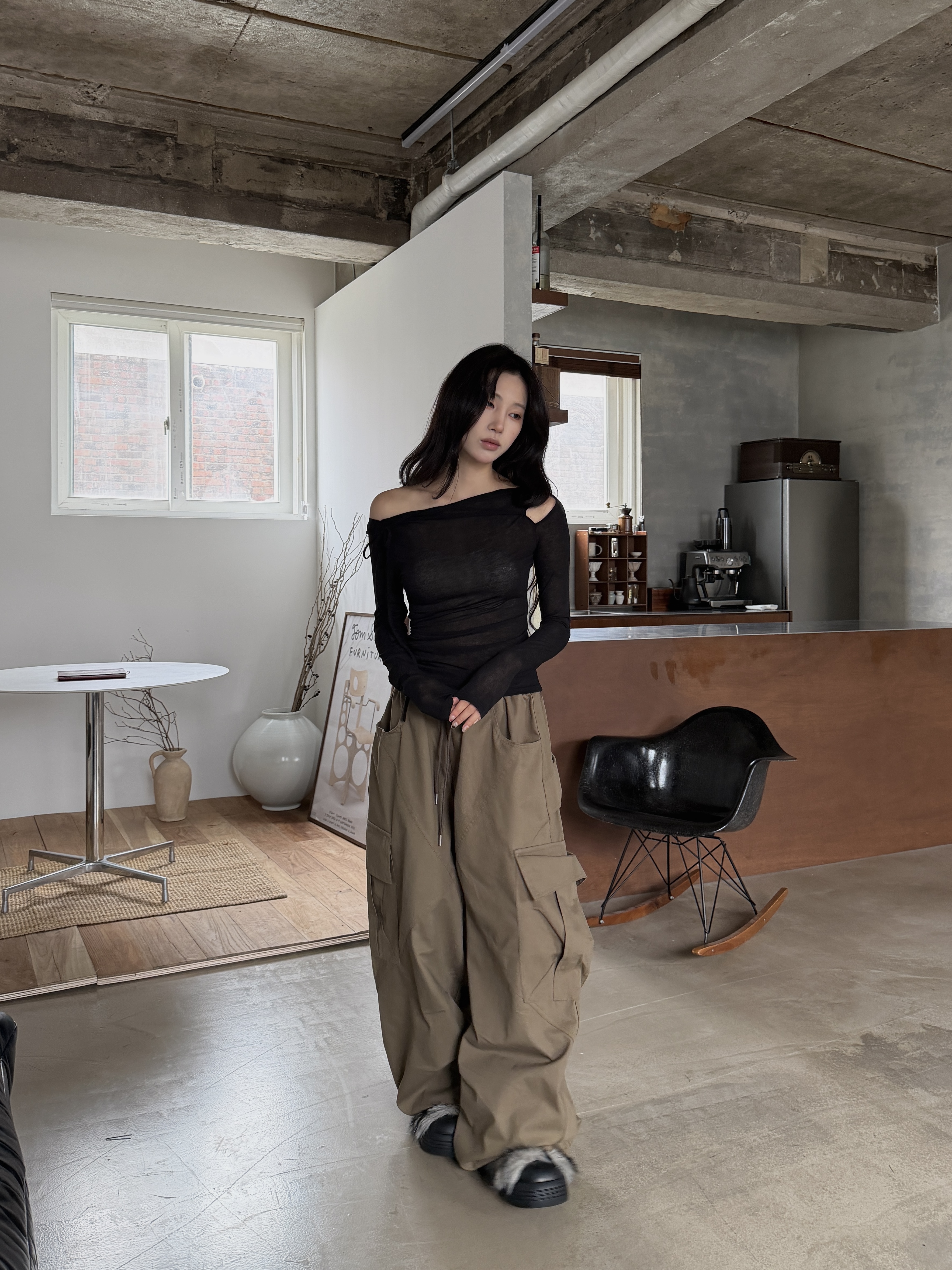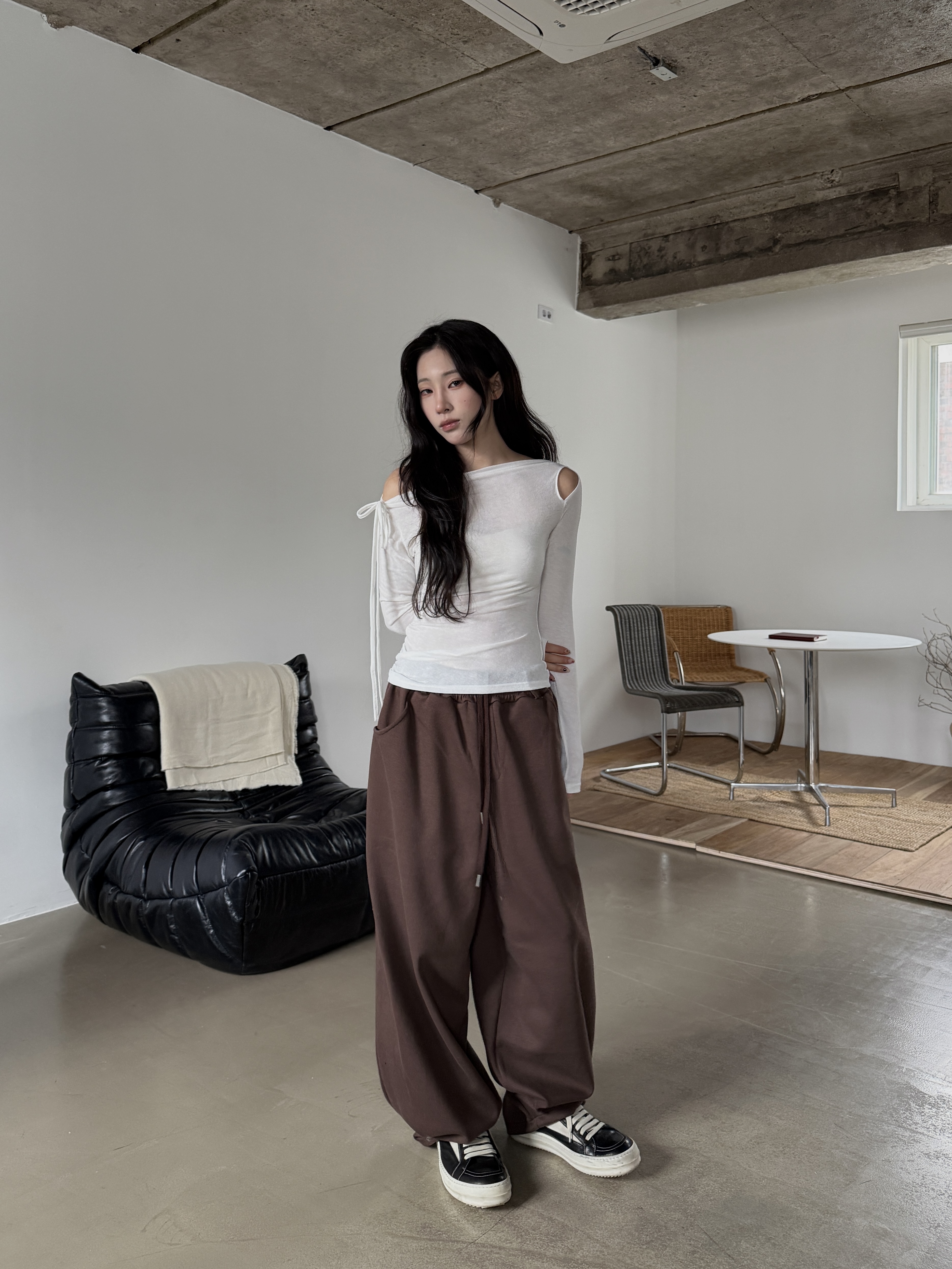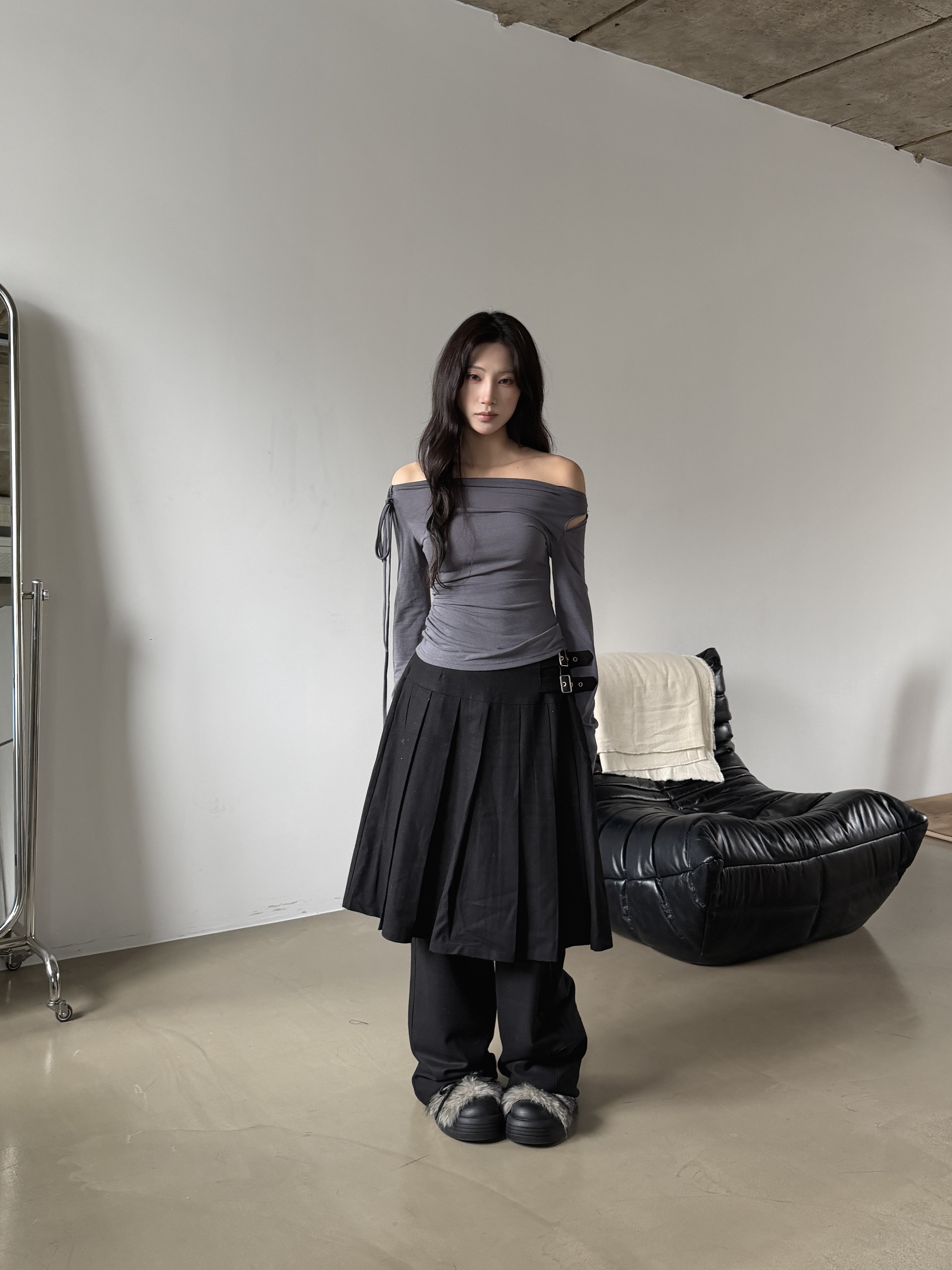韓系簡約風格/側綁帶設計/斜肩鏤空細節/一字領多穿法/抓皺修身顯瘦/一年四季