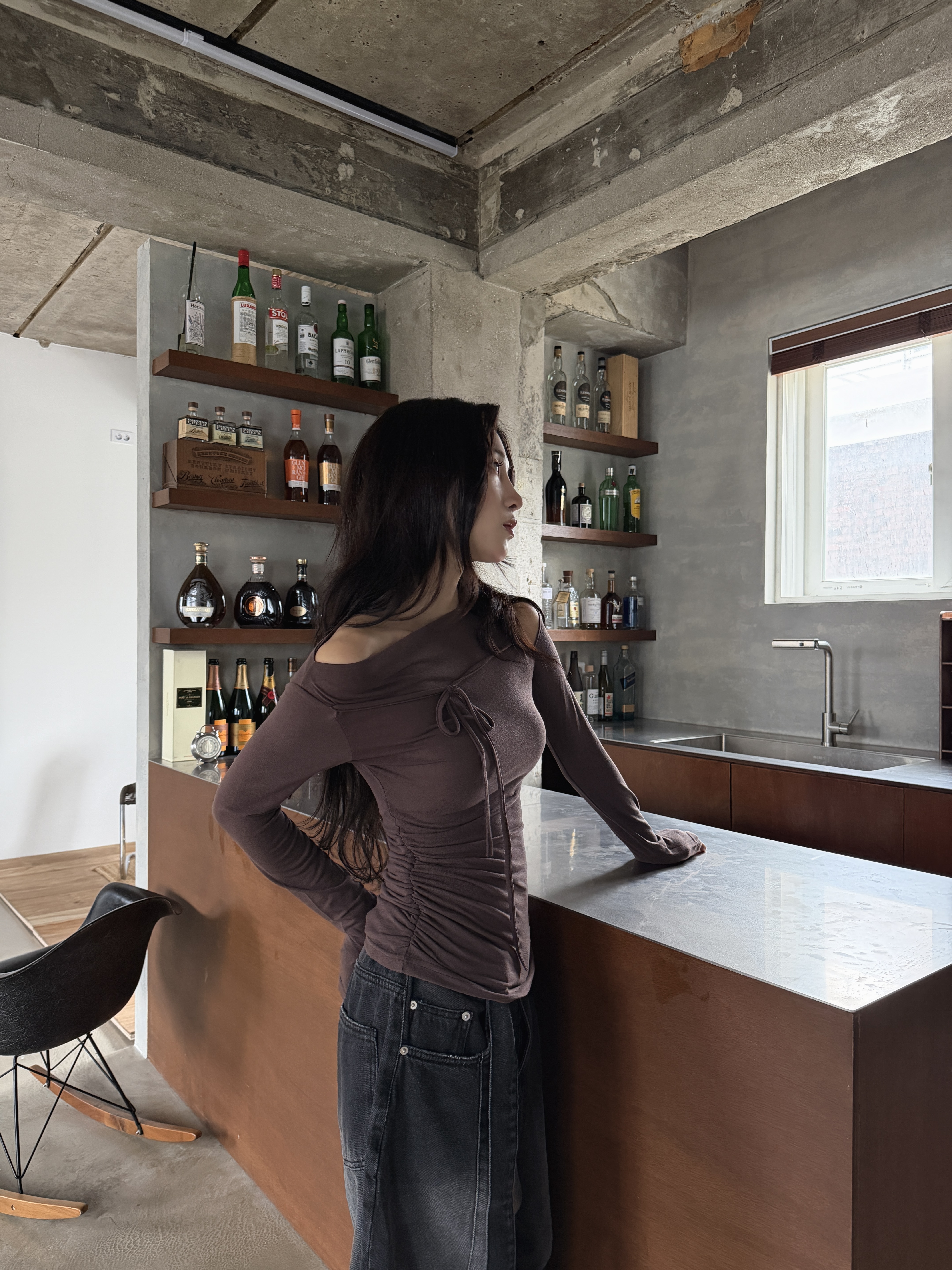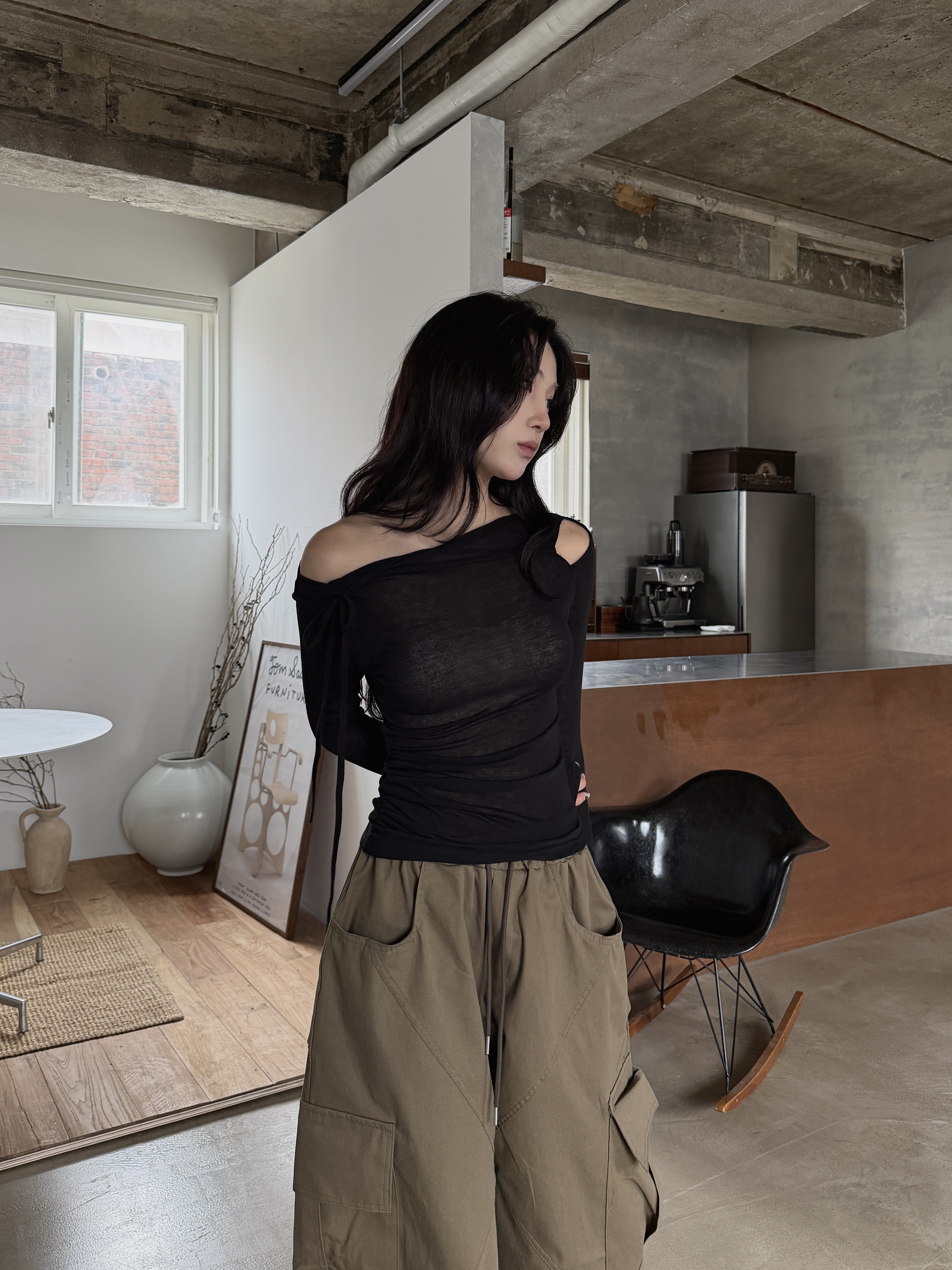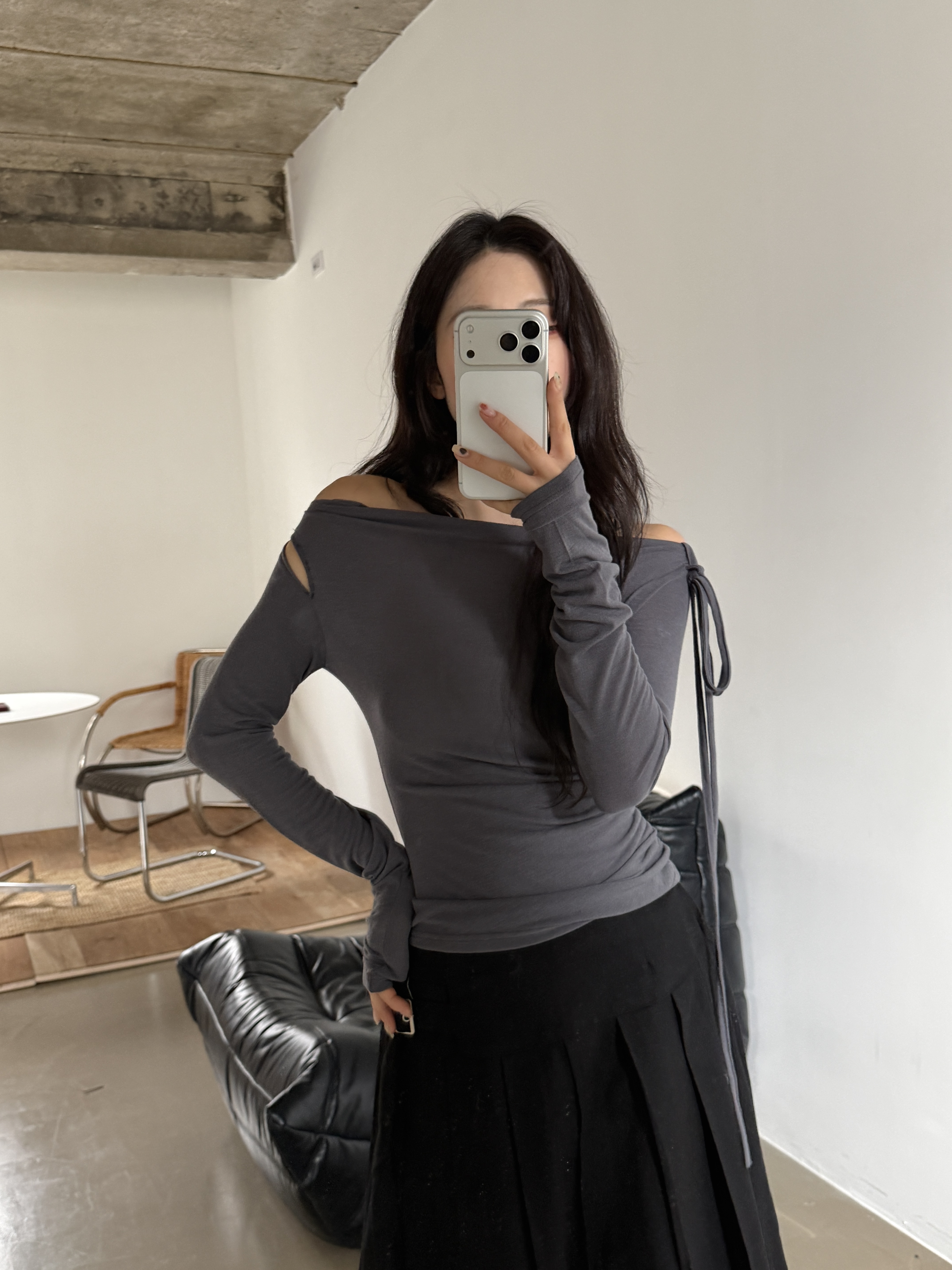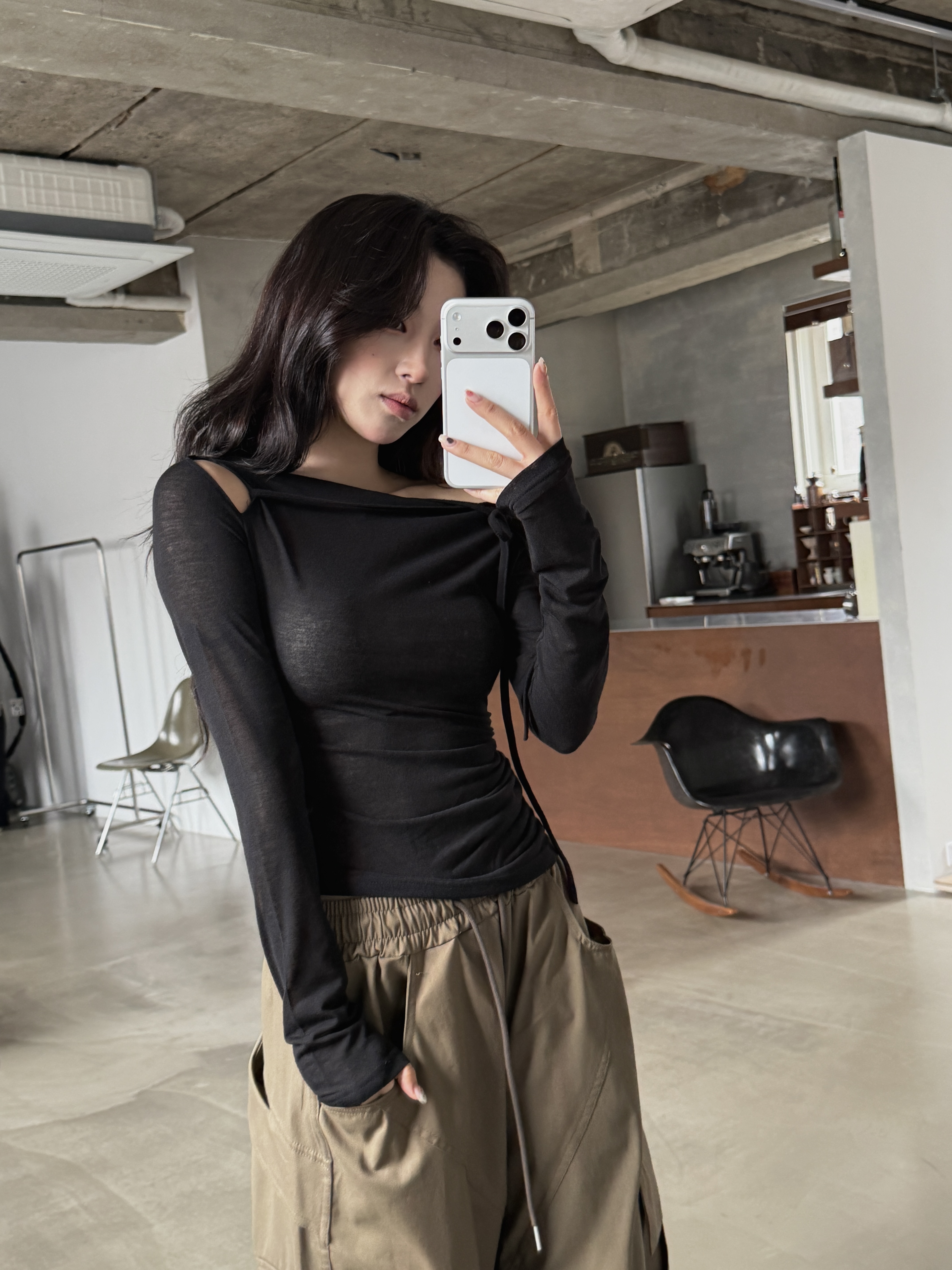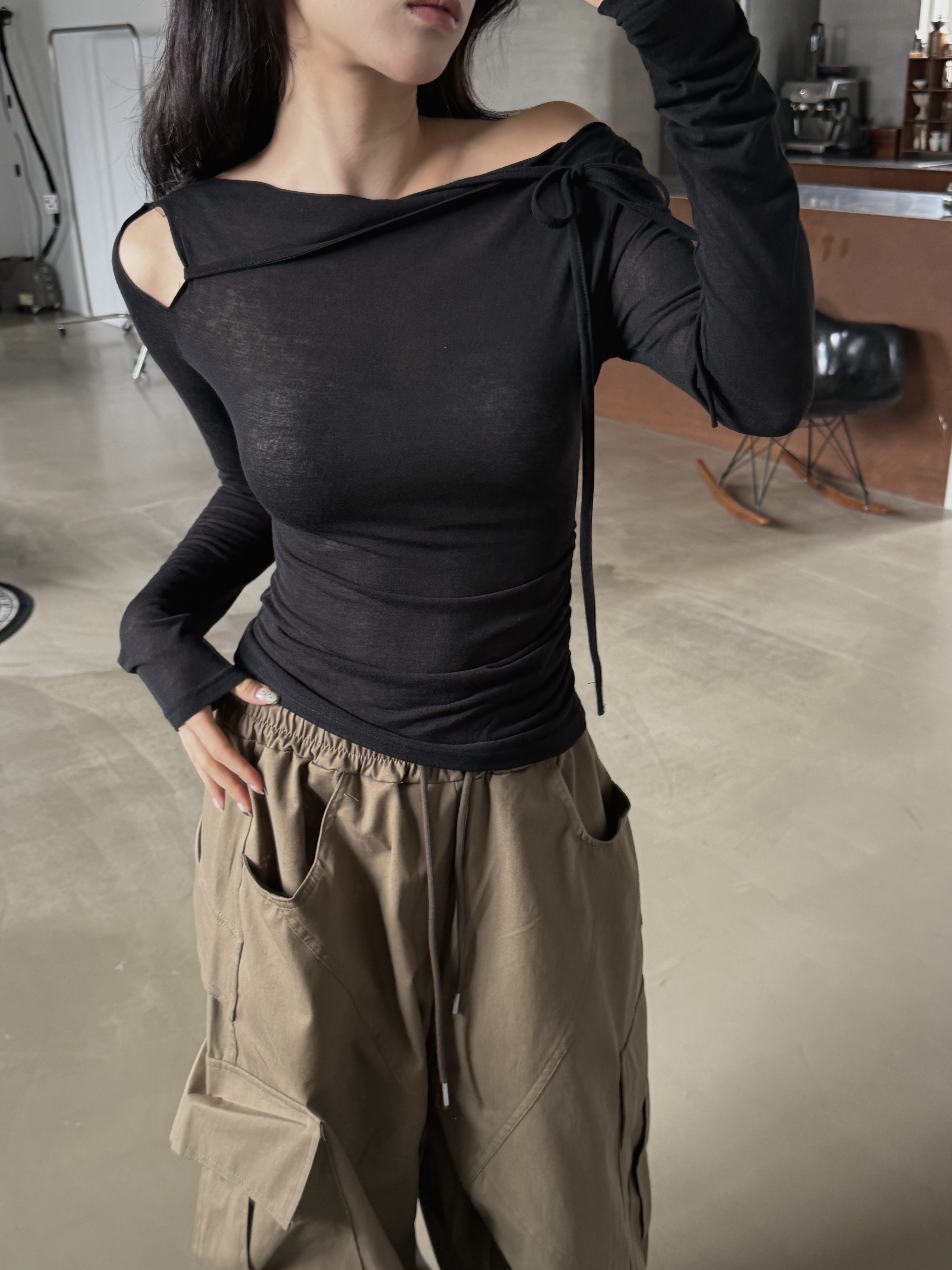 側綁帶 斜肩鏤空 抓皺修身長袖上衣