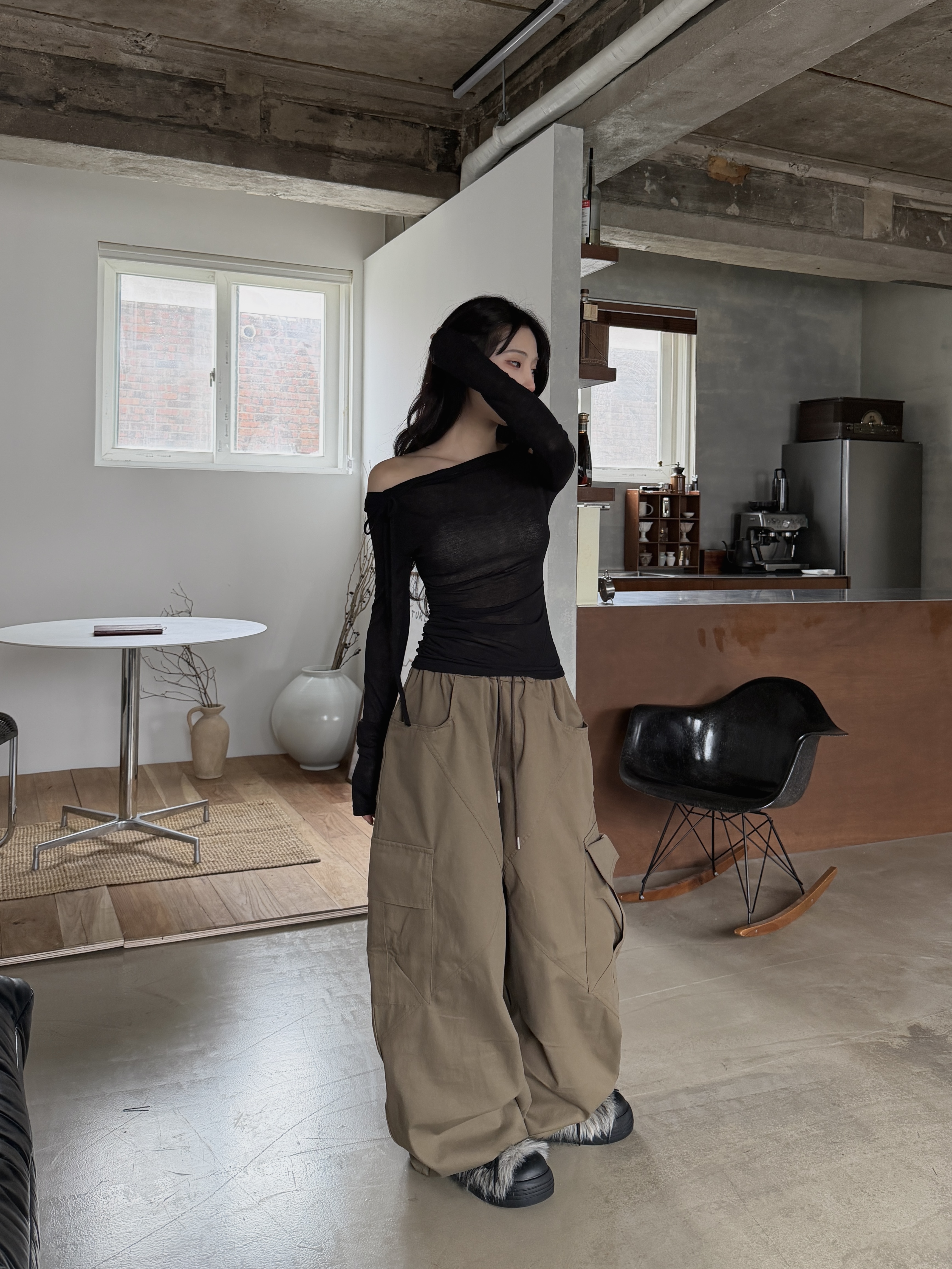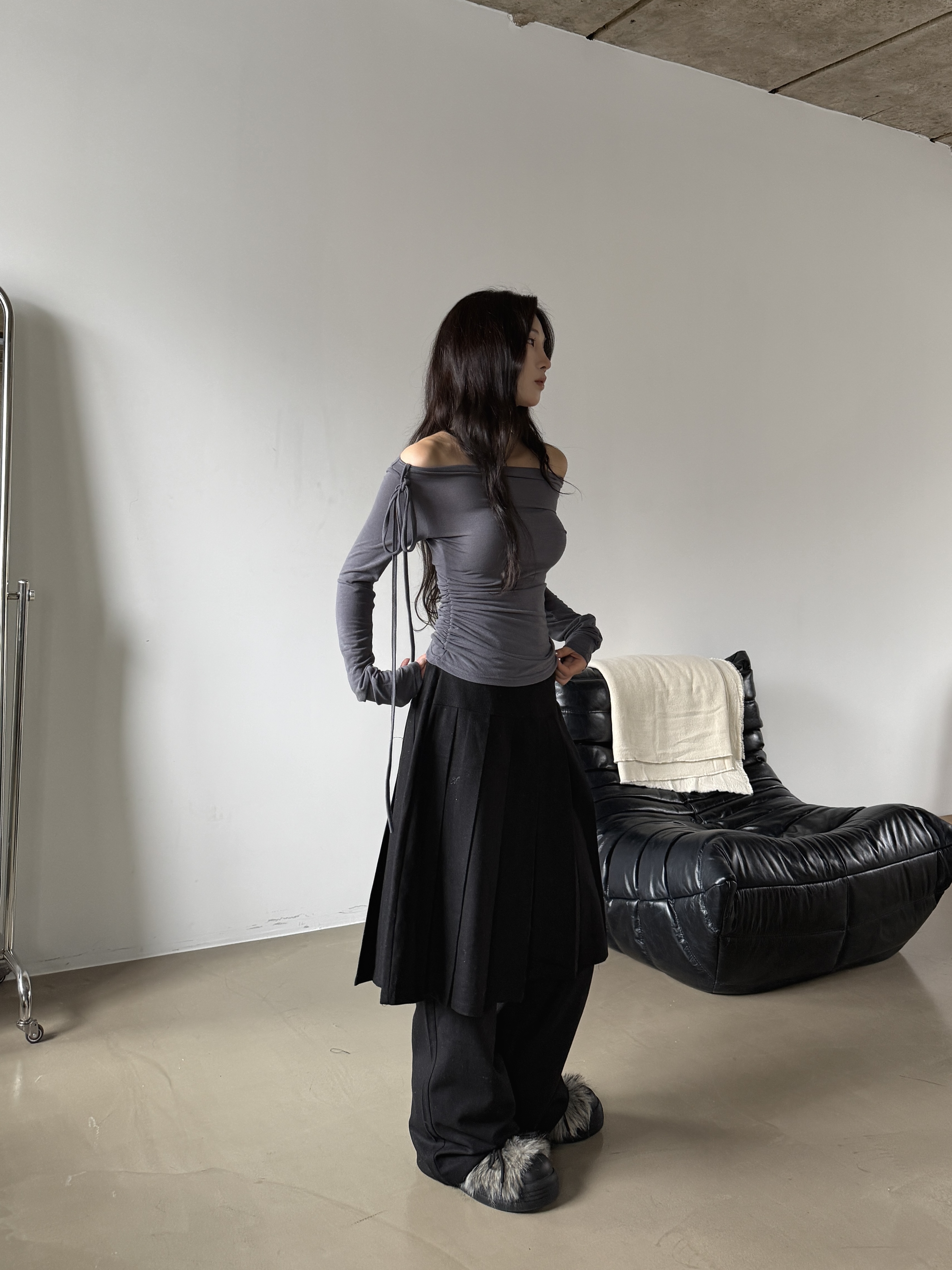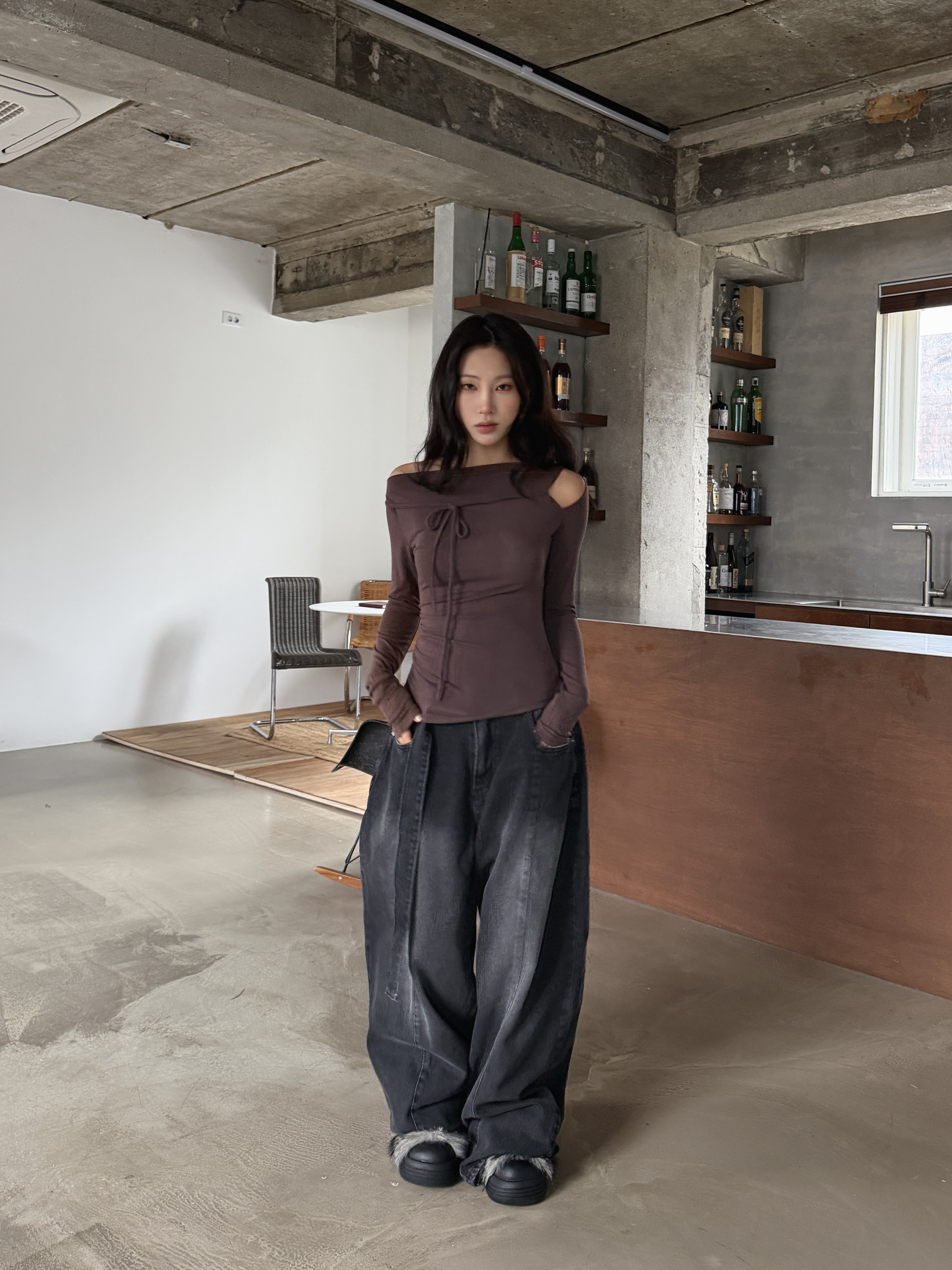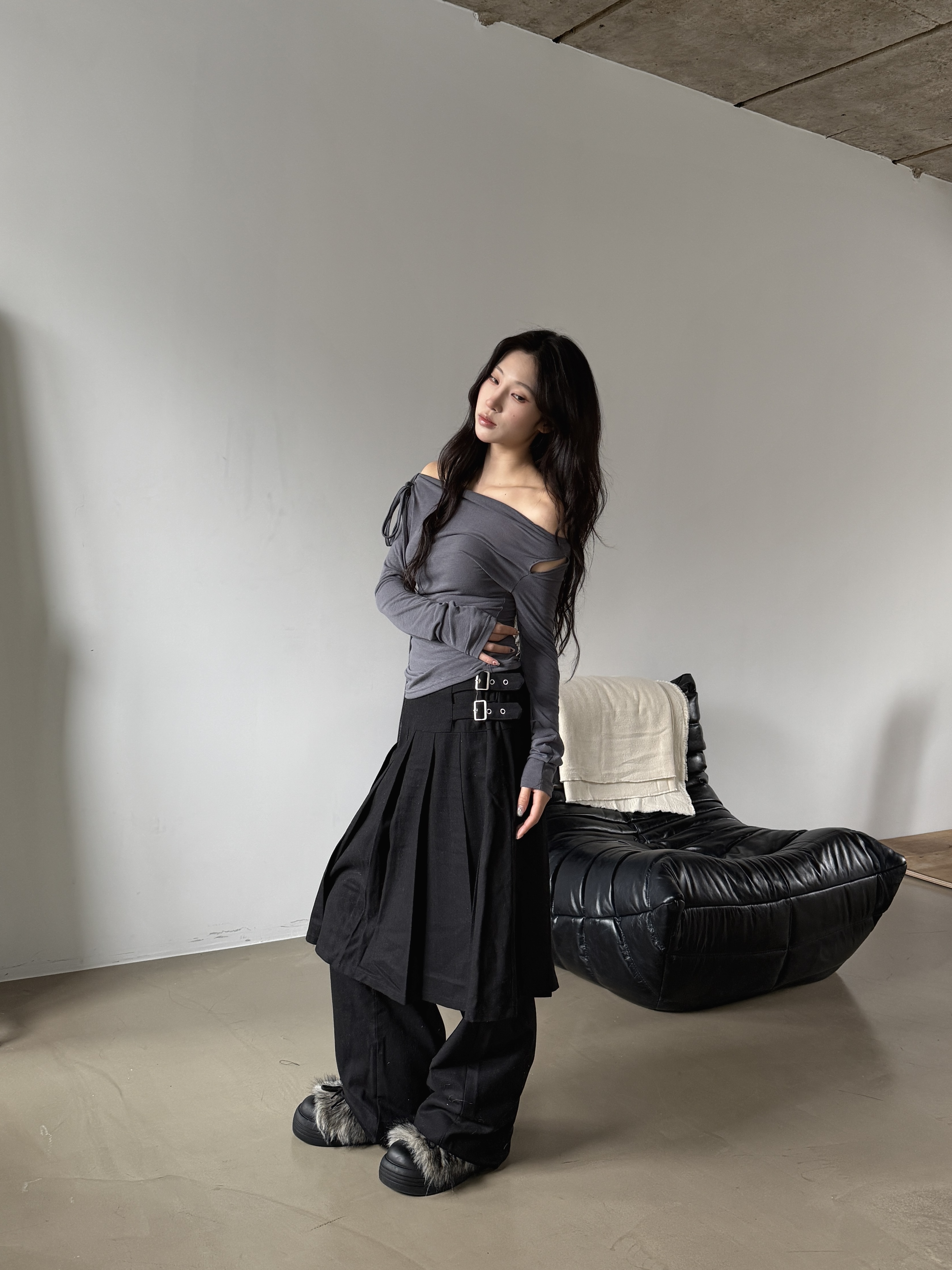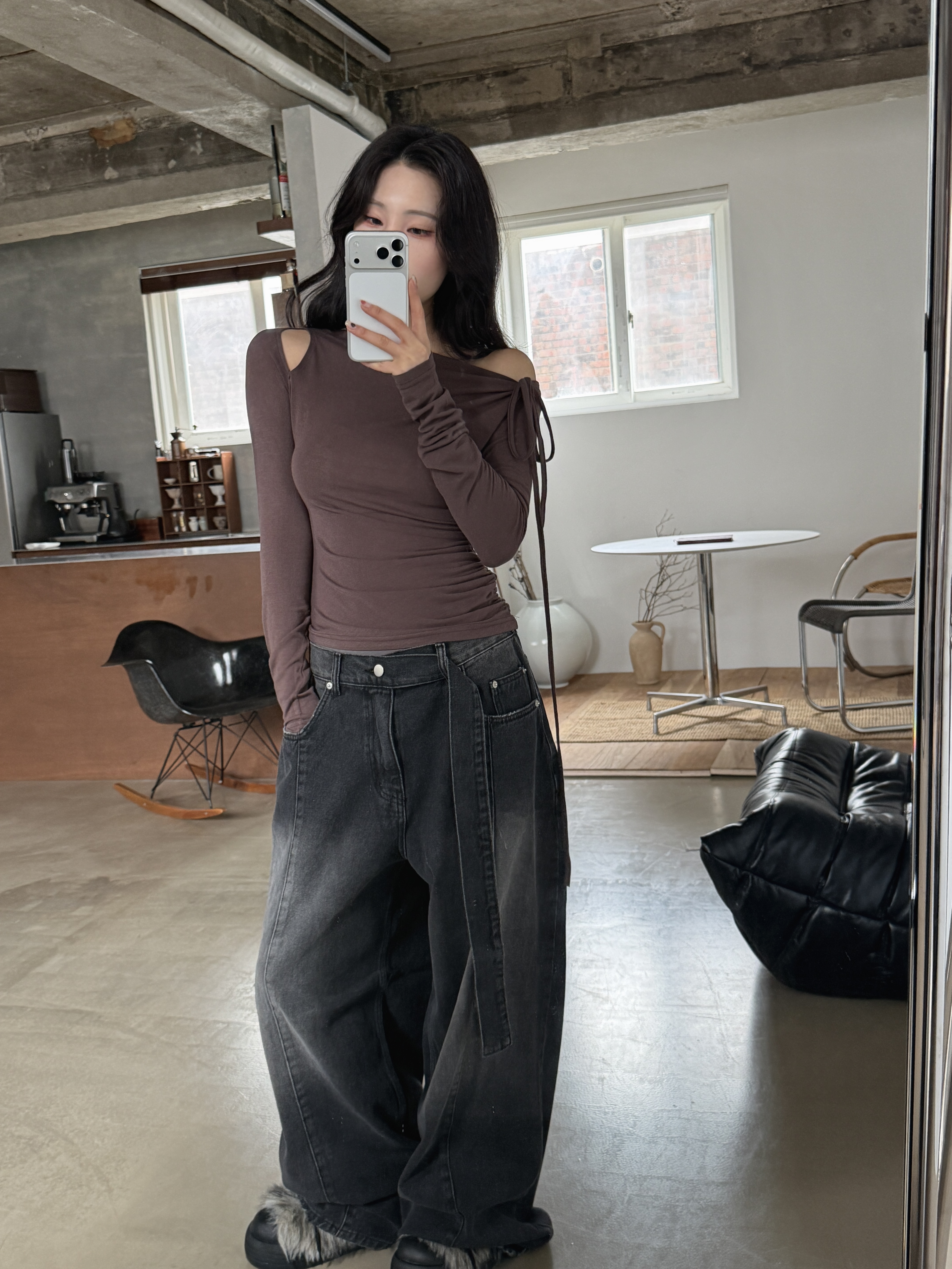 側綁帶 斜肩鏤空 抓皺修身長袖上衣