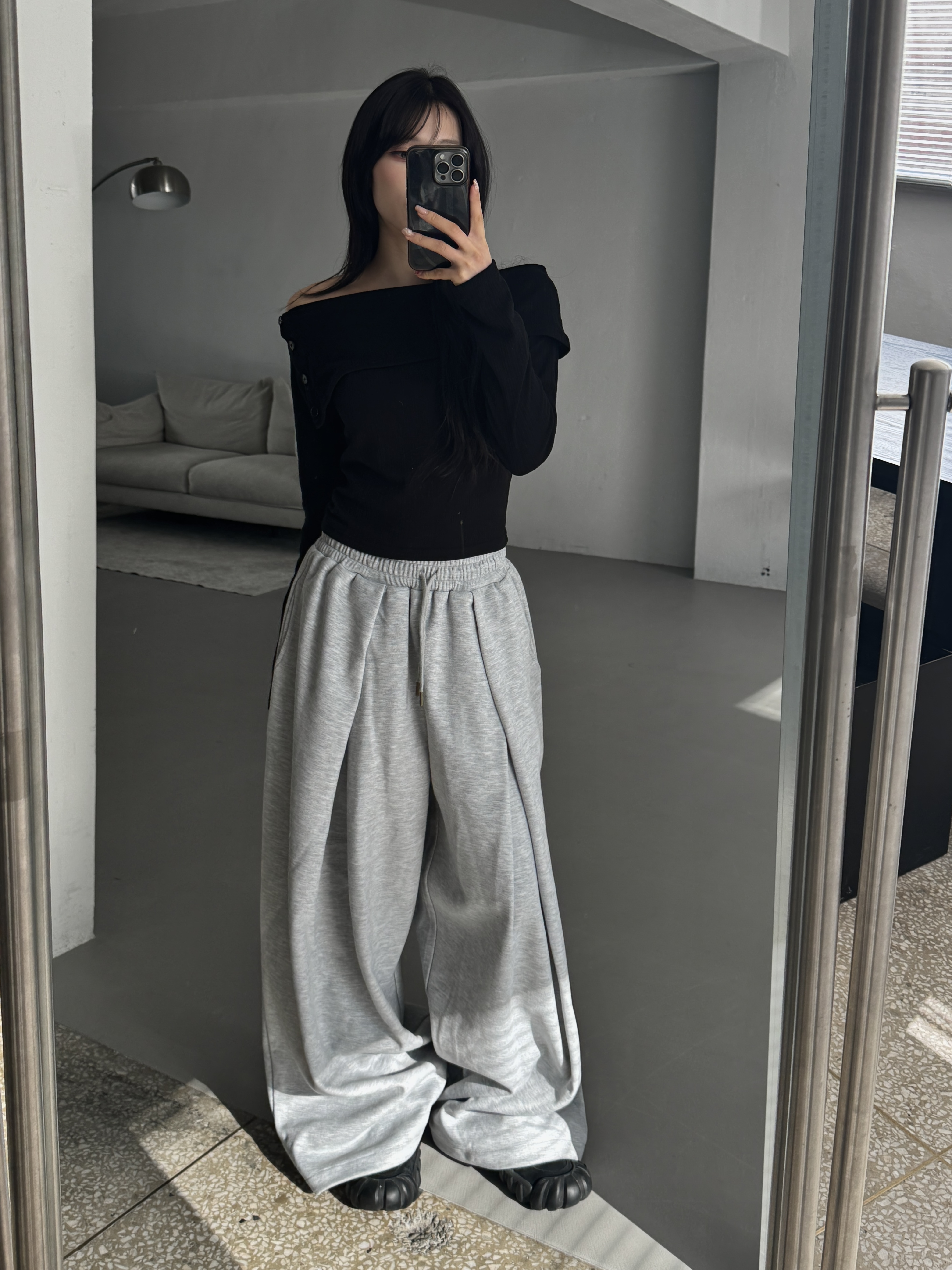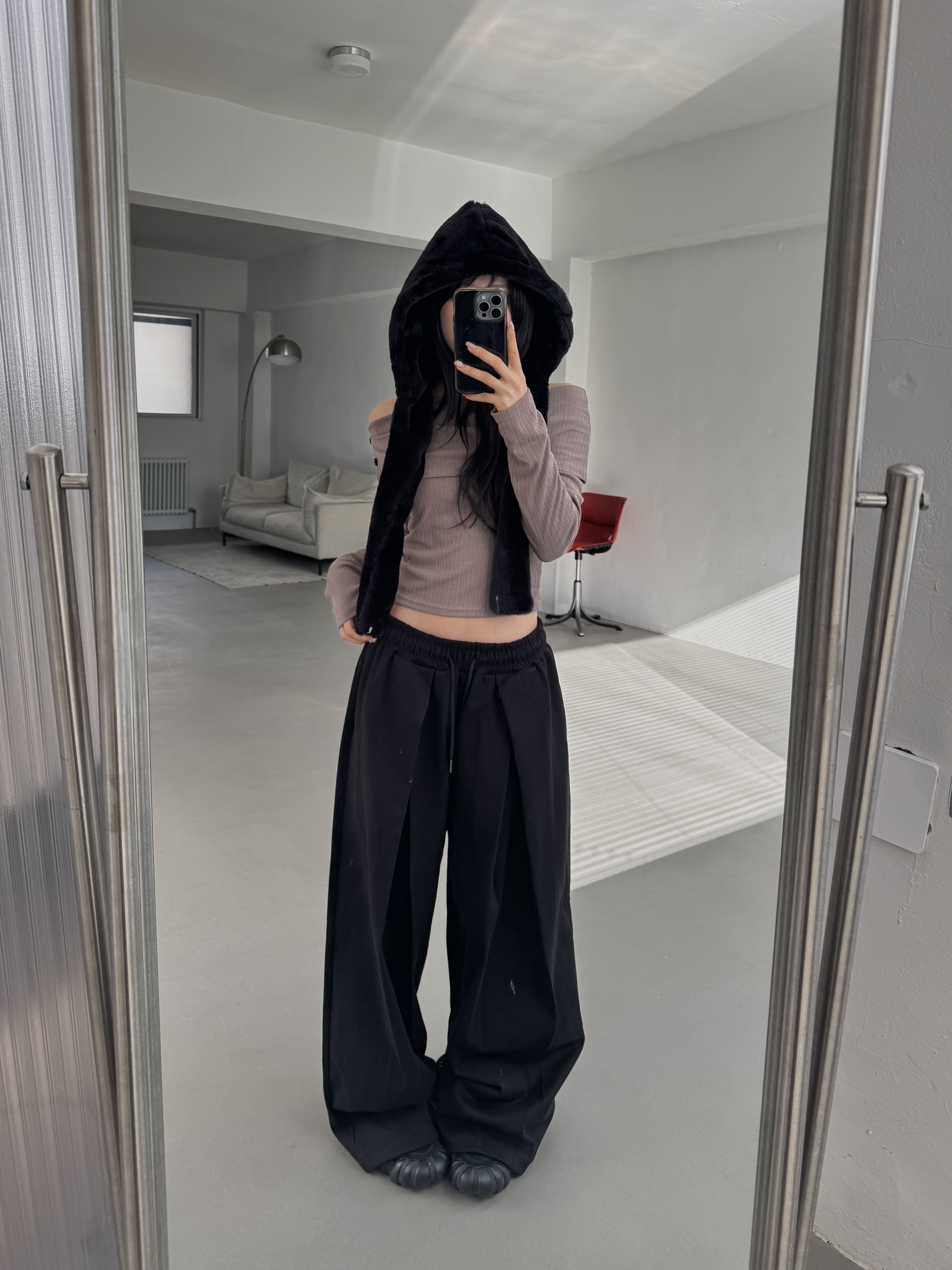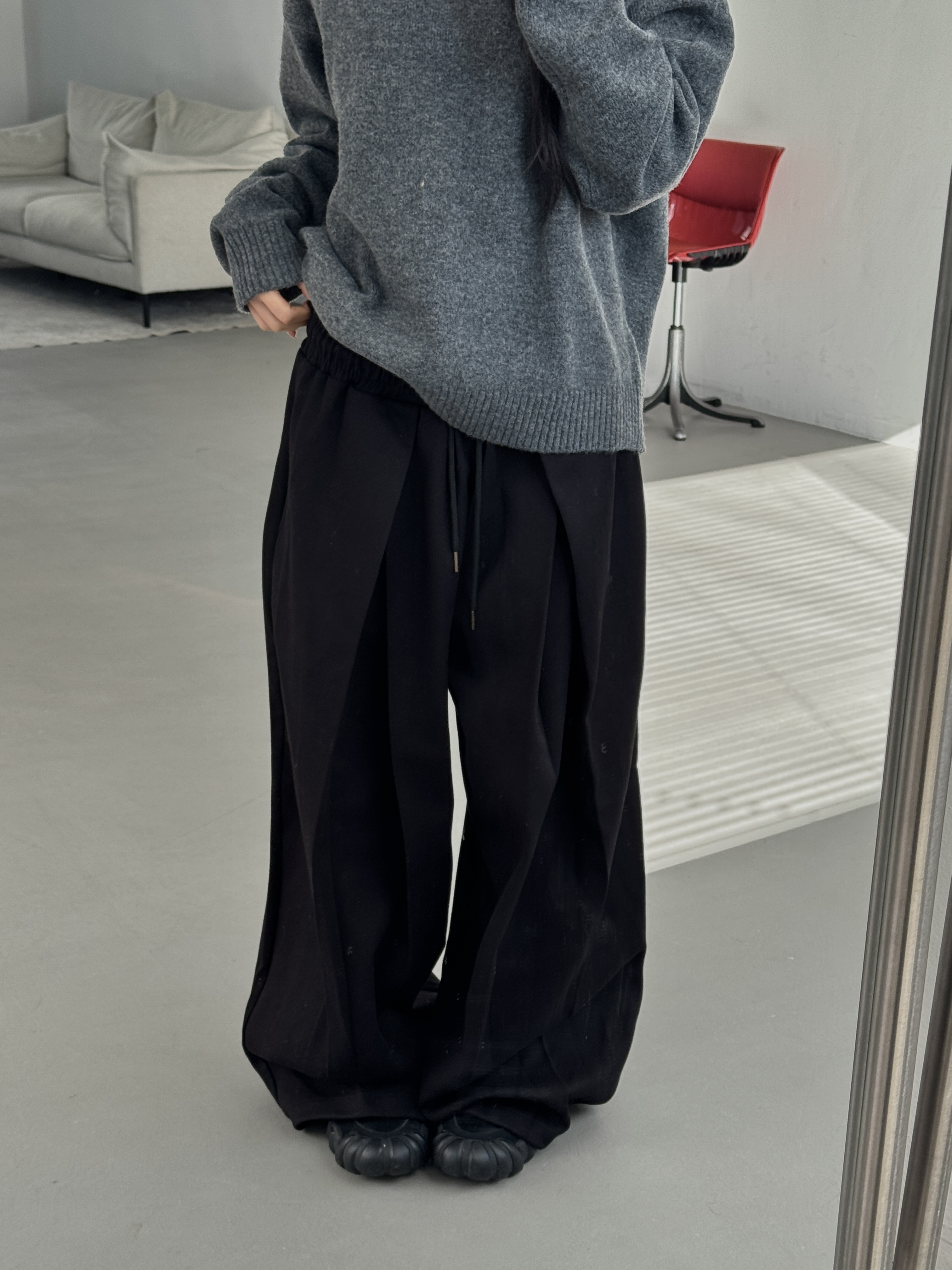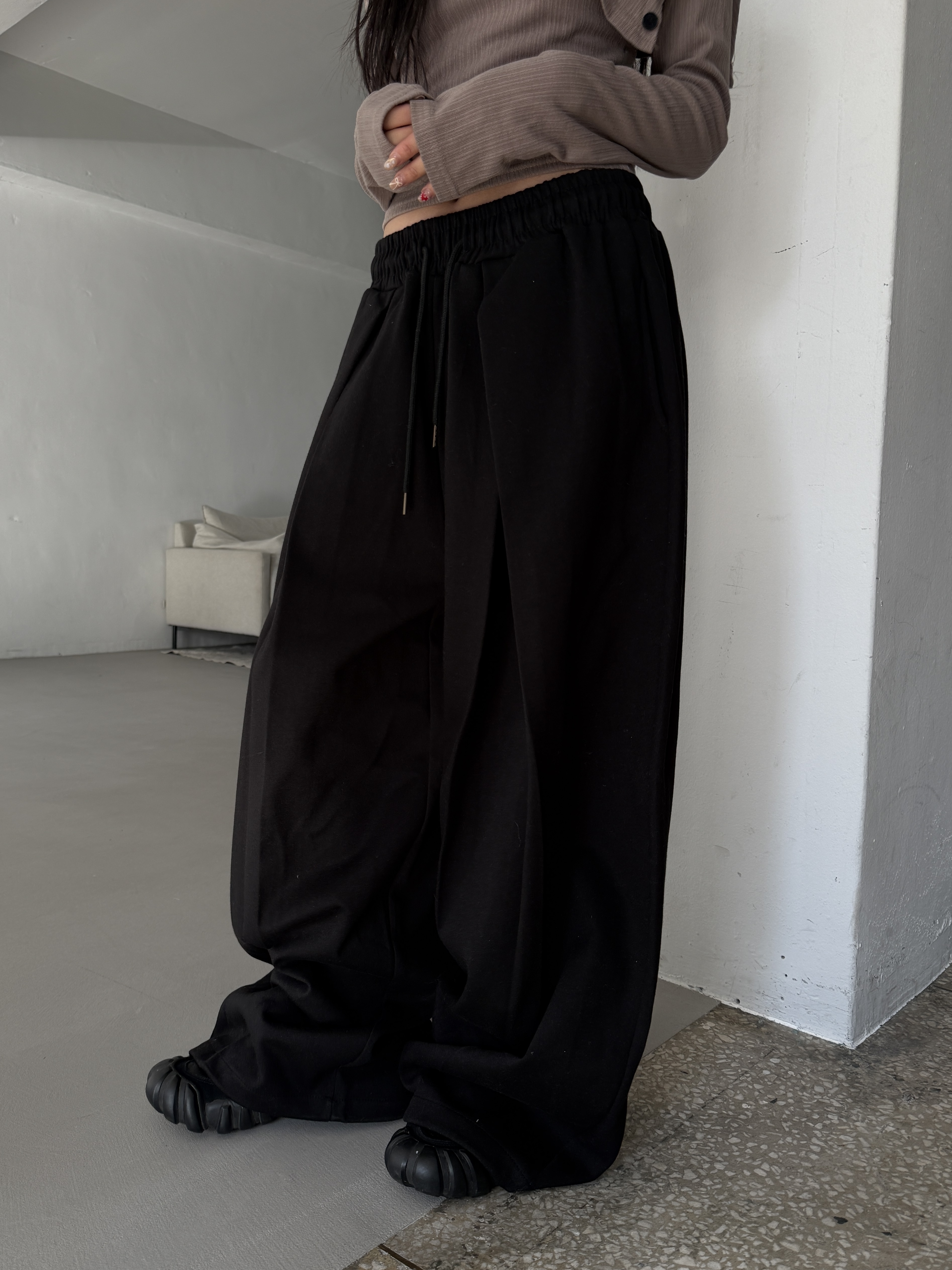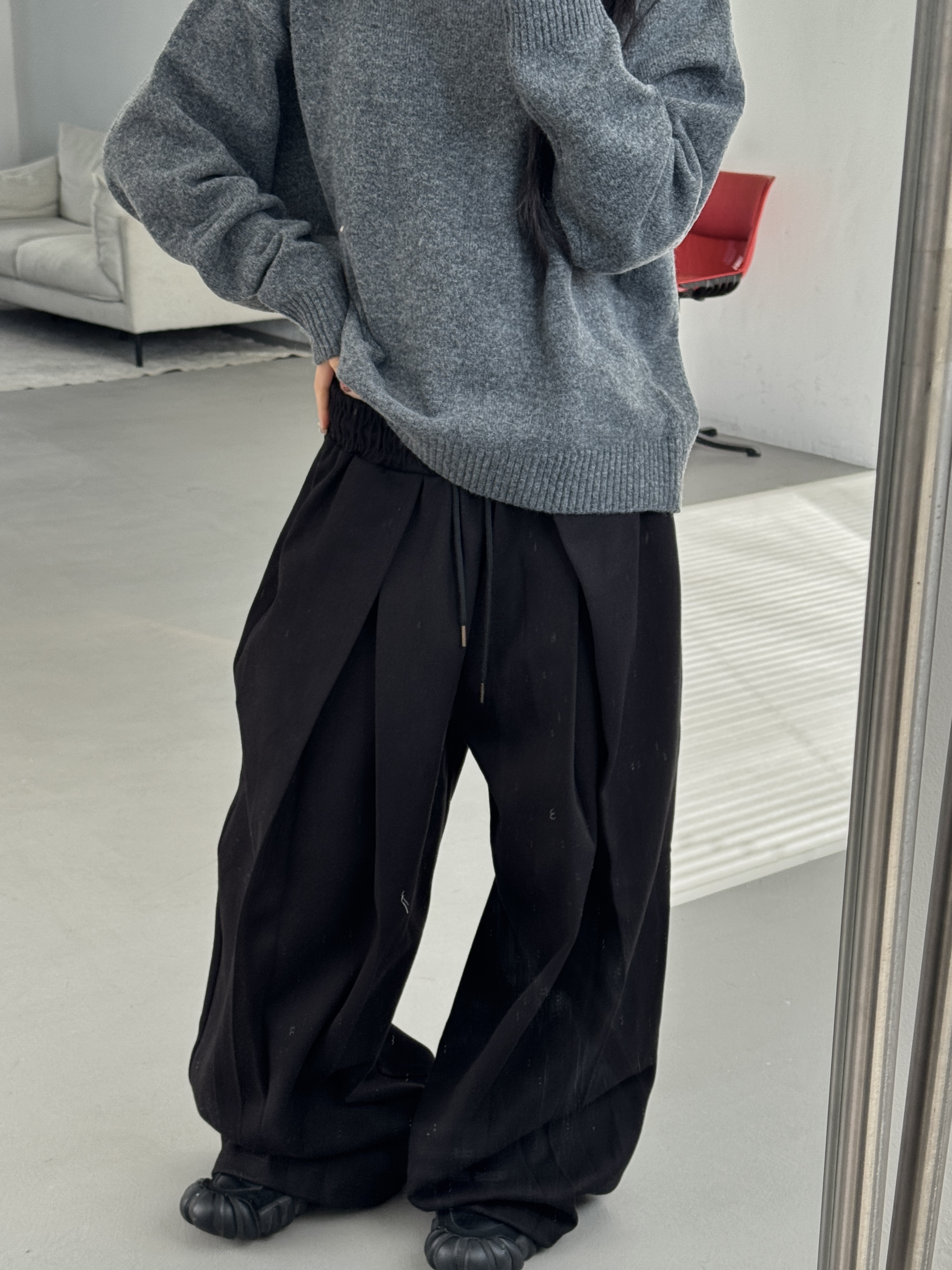 [IDEAL MADE]立體摺線 寬鬆闊腿棉褲(黑)(現貨)