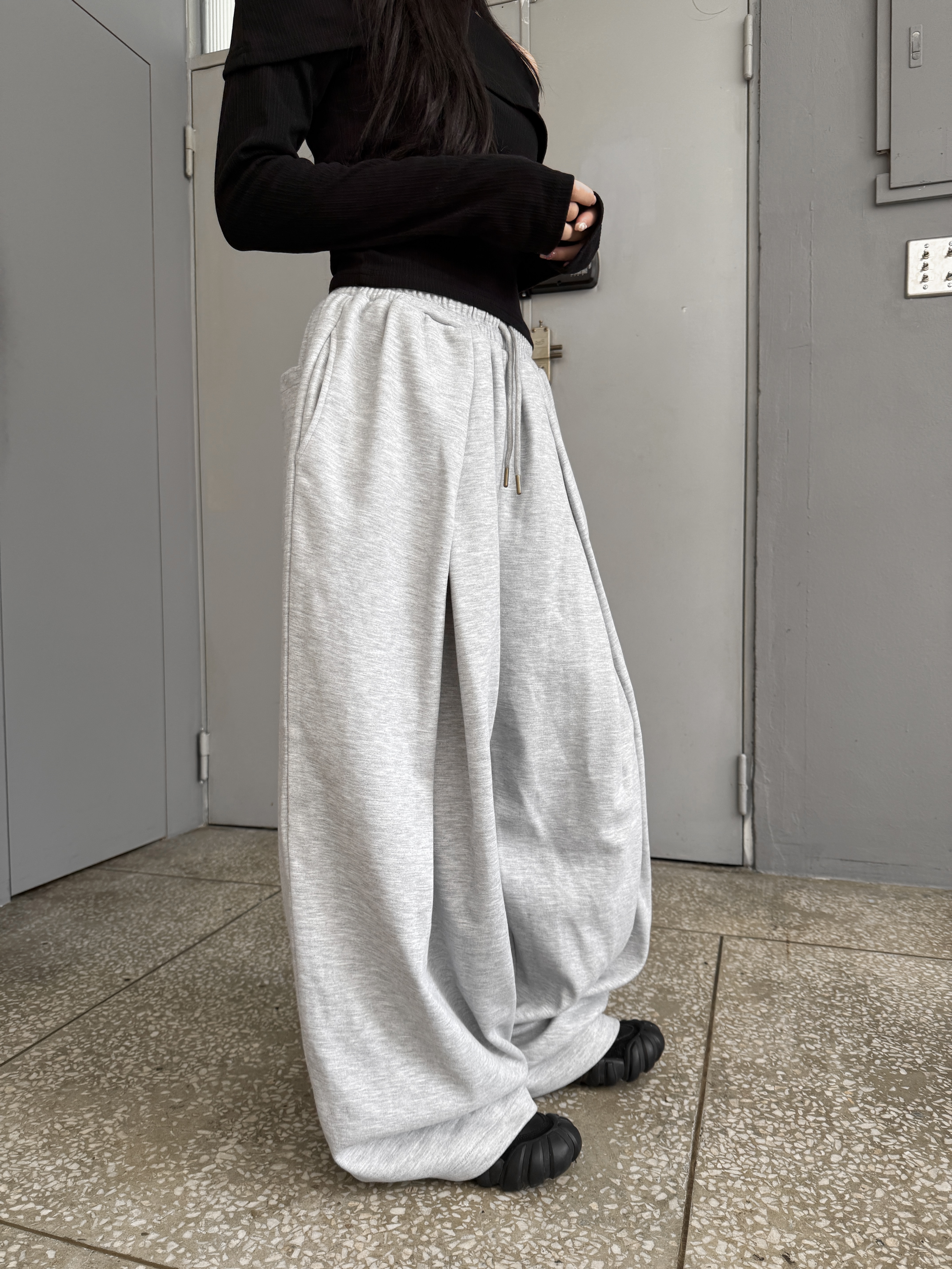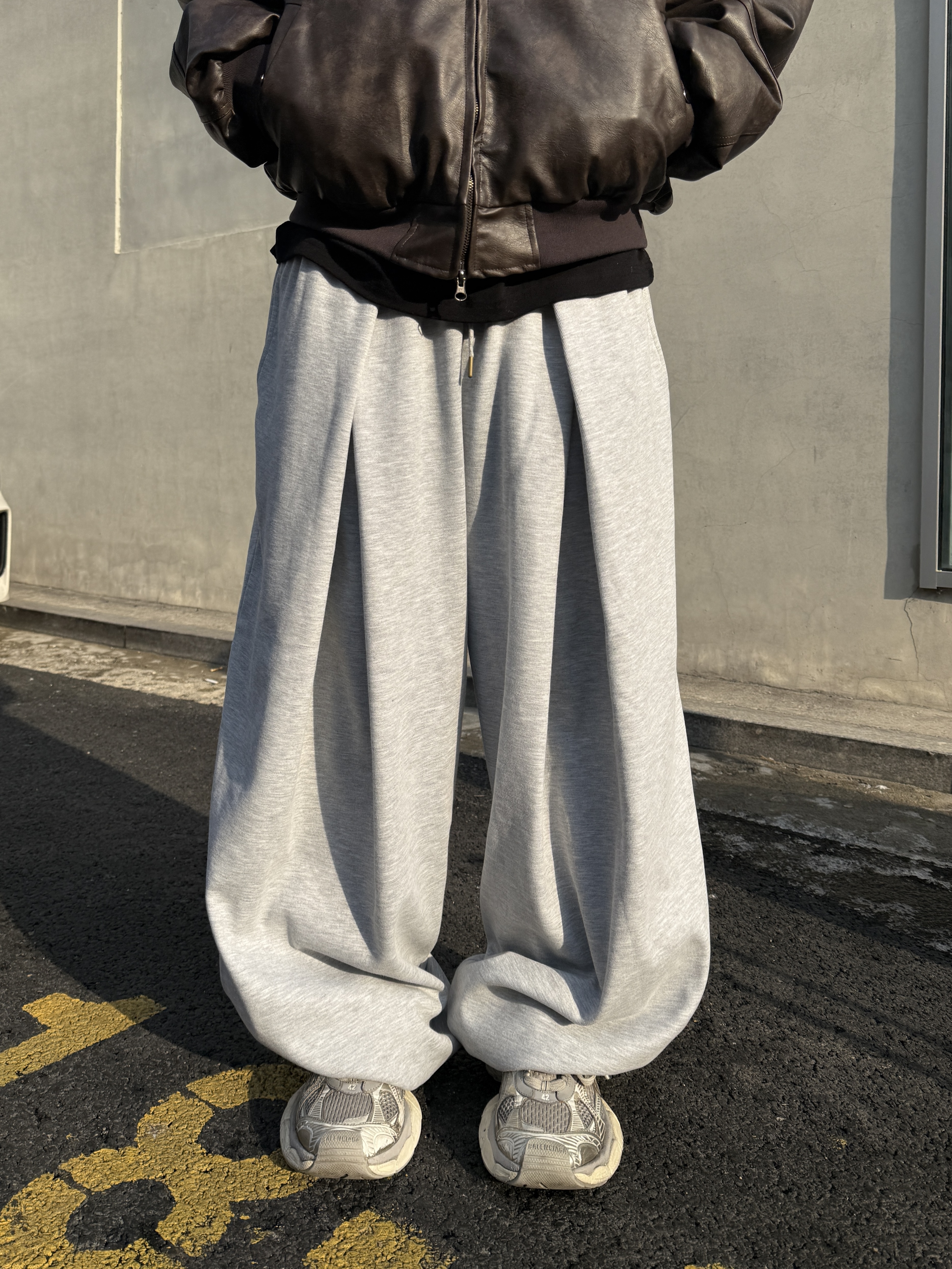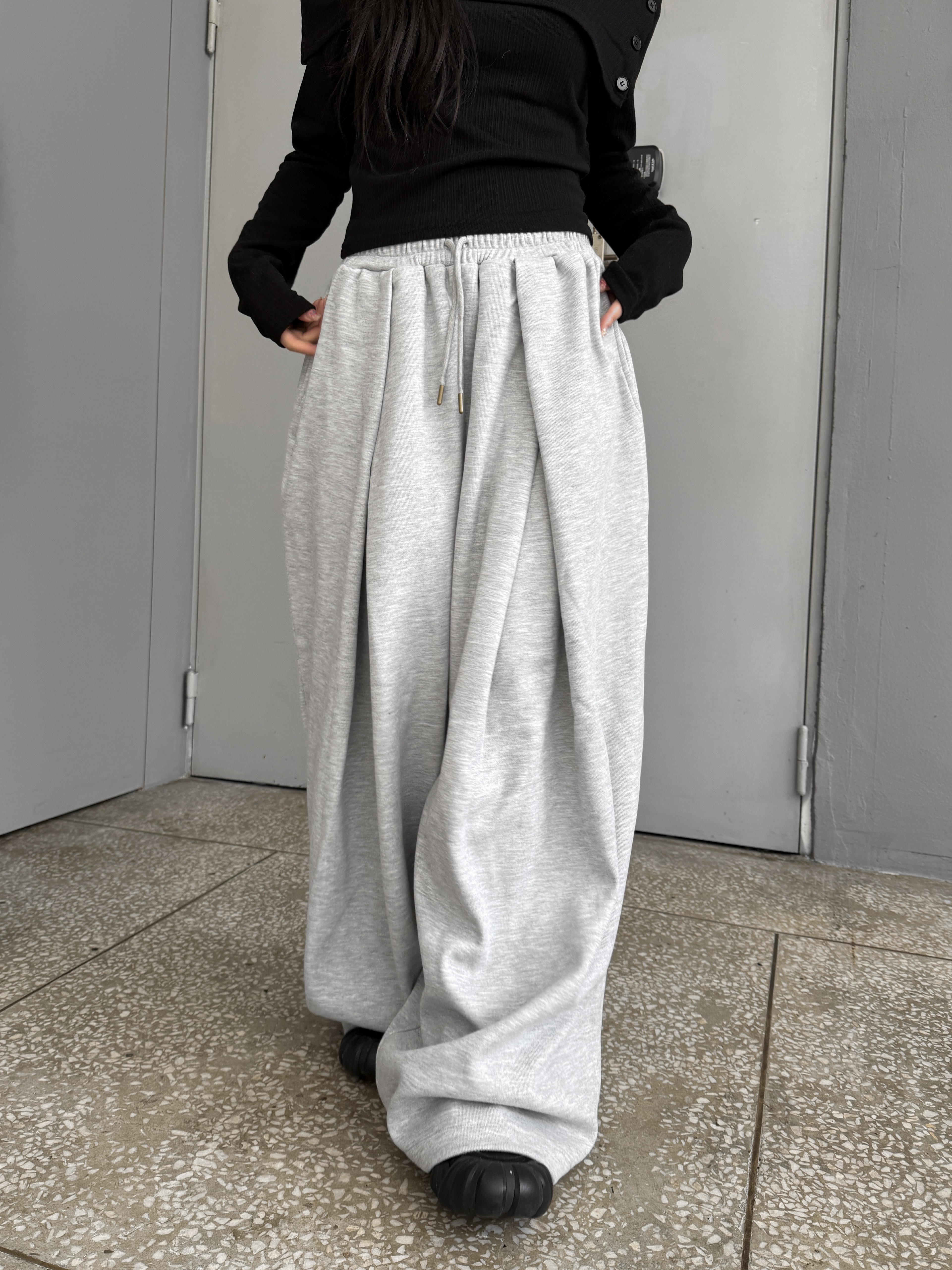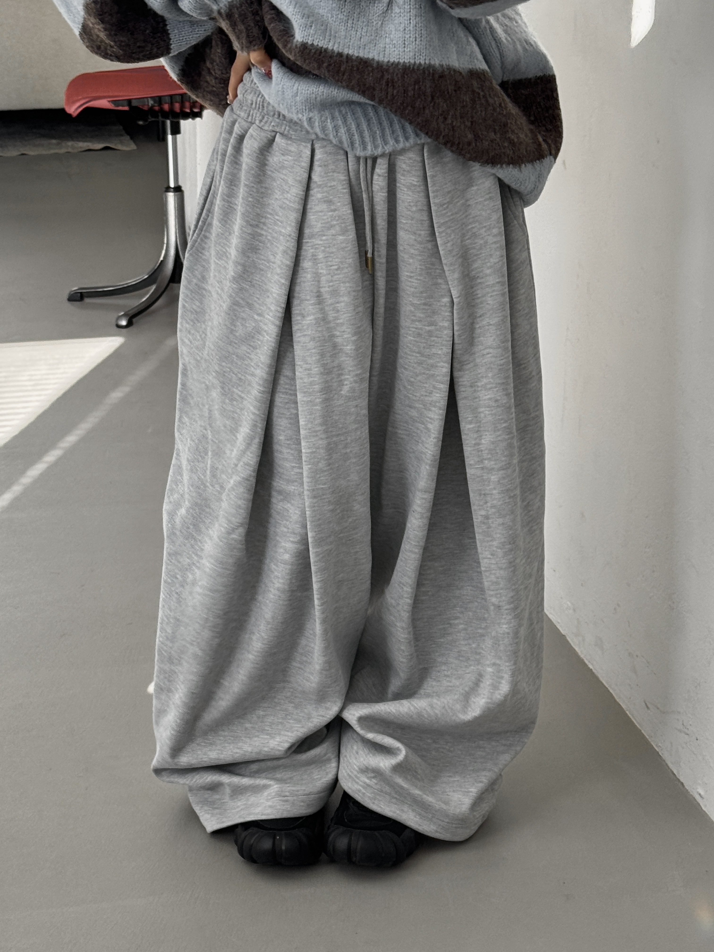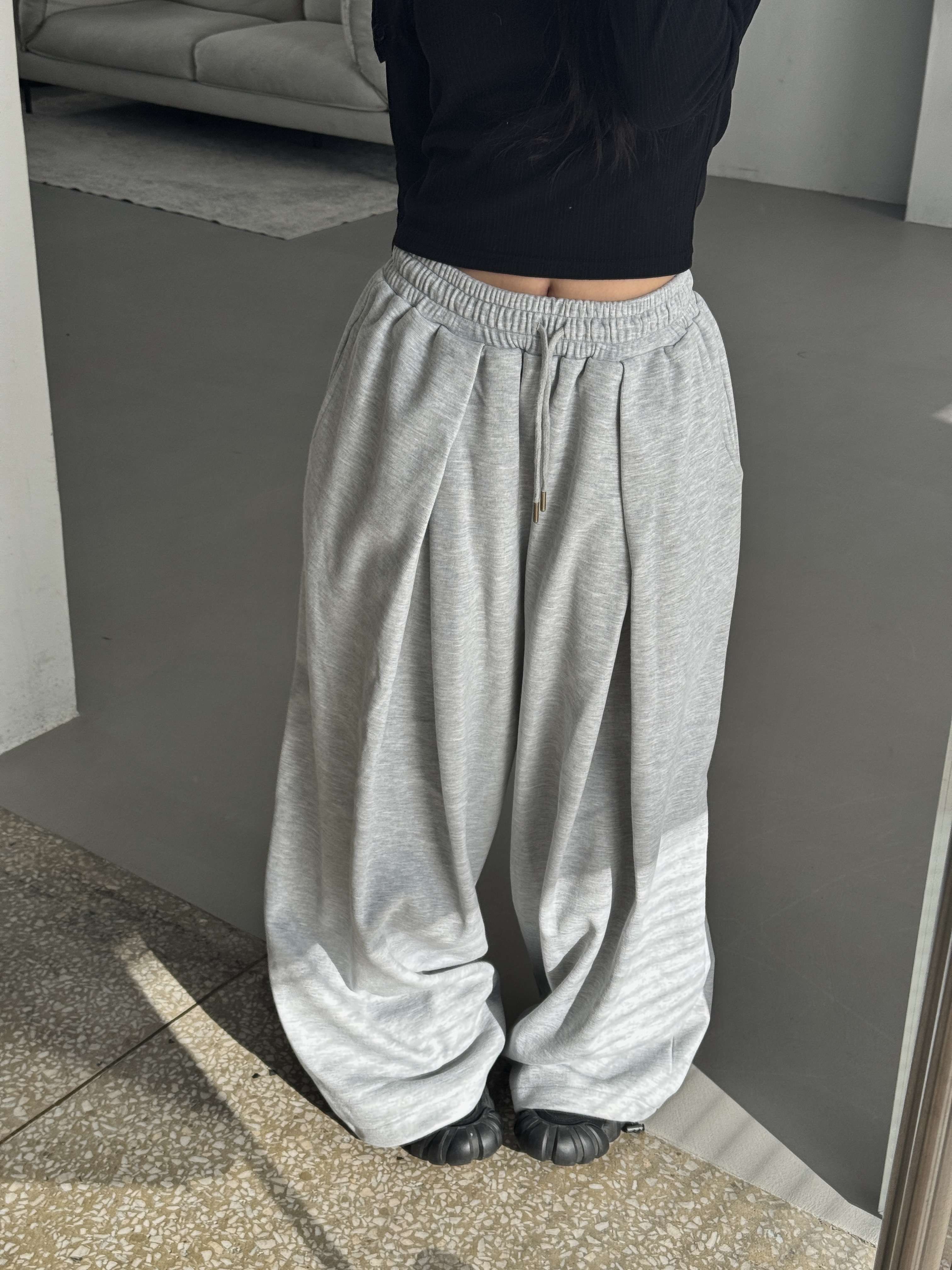 [IDEAL MADE]立體摺線 寬鬆闊腿棉褲(灰)(現貨)