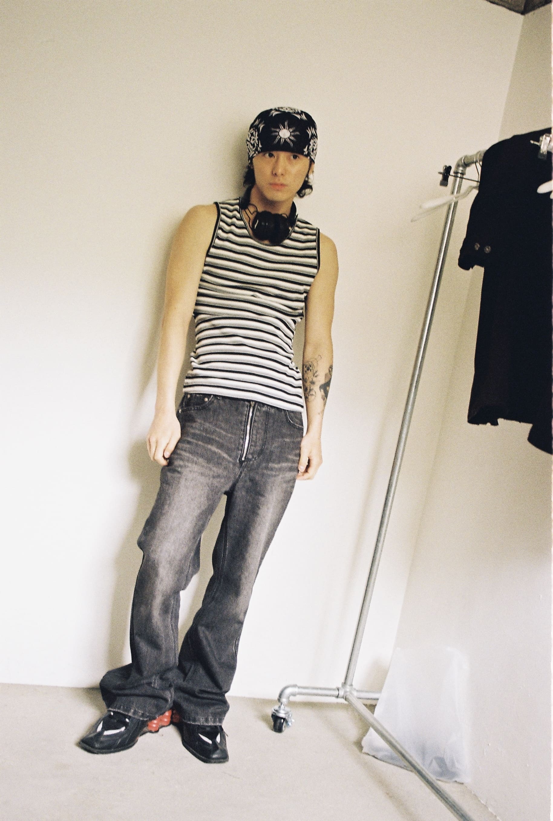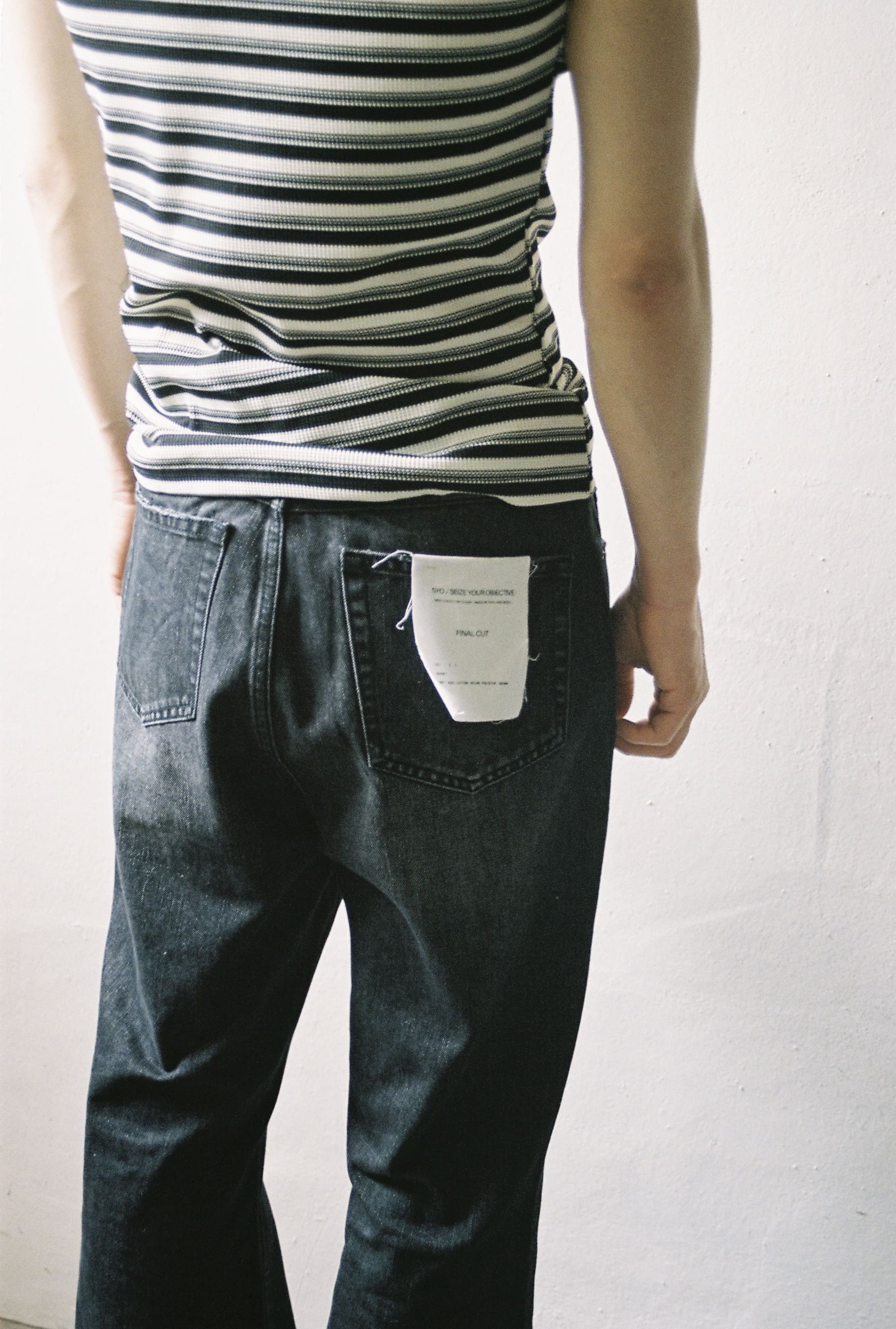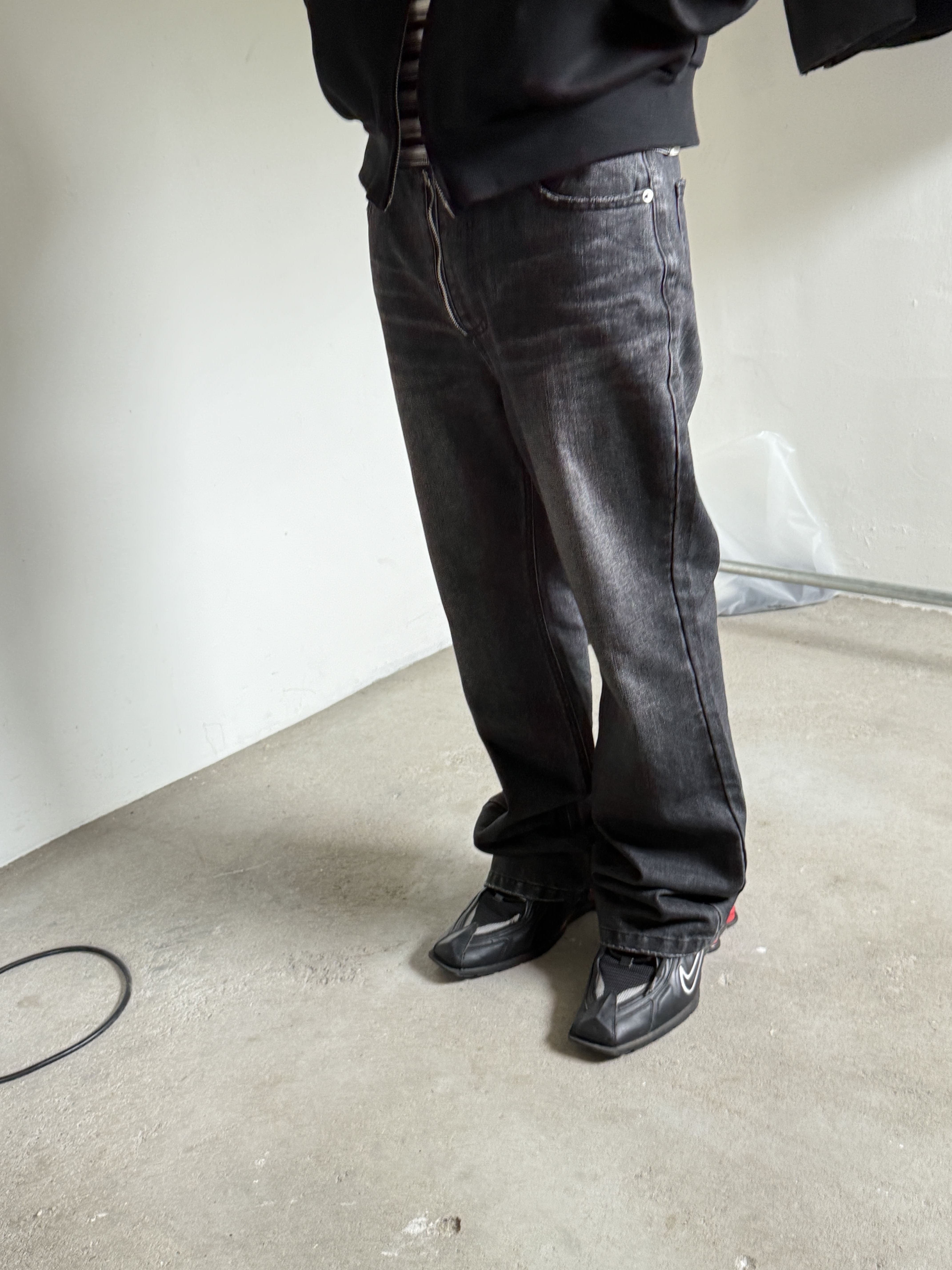 先鋒未來風格/微喇叭修飾版型/自然水洗工藝/前移側線設計修飾腿型比例/不規則鬚邊處理